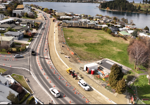 So, now that it’s warming up, and most of our underground works complete, we can begin laying the new road surface along Frankton Road. We will begin rolling out asphalt from one end of the arterial route to the other. We have already begun with the footpath on the lakefront side of Frankton Road and will continue towards the southern side of Melbourne Street in the upcoming weeks.